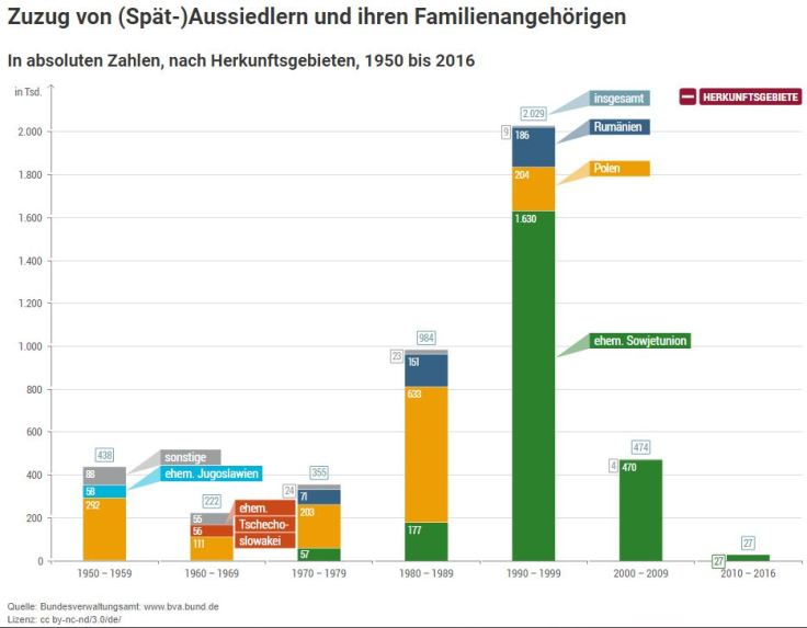 Von 1950 an bis heute wanderten etwa 4,6 Millionen Menschen im Rahmen des Aussiedler-/Spätaussiedlerzuzugs nach Deutschland ein, zweieinhalb Millionen von ihnen seit 1990. In der Forschung unterteilt man die Geschichte der deutschen Aussiedlermigration in vier Phasen. Jede dieser Phasen unterscheidet sich im Hinblick auf die betroffenen Personengruppen wie auf die Aus- und Einreiseregelungen der beteiligten Staaten (insbesondere die ehemalige Sowjetunion und Polen).